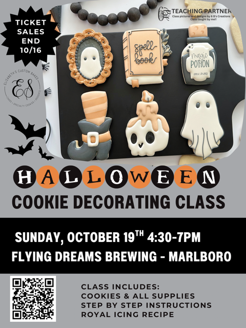 Learn to decorate these haunted cookies with royal icing at Flying Dreams Brewing in Marlboro, Ma. Â Each ticket includes 6 freshly baked sugar cookies All icing and supplies needed to decorate Step by step instruction from Liz My very own royal icing recipe A tray to take home your creations.